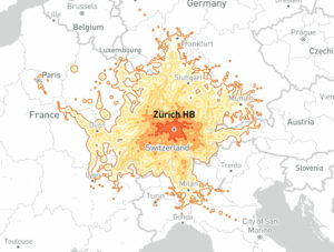 A map that shows you how far you can get in Europe in 5 hours by train.